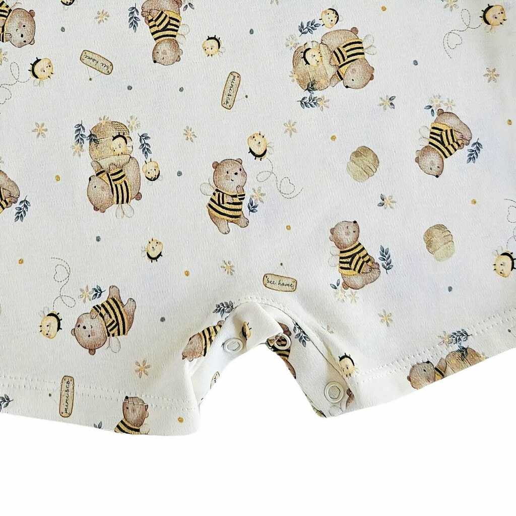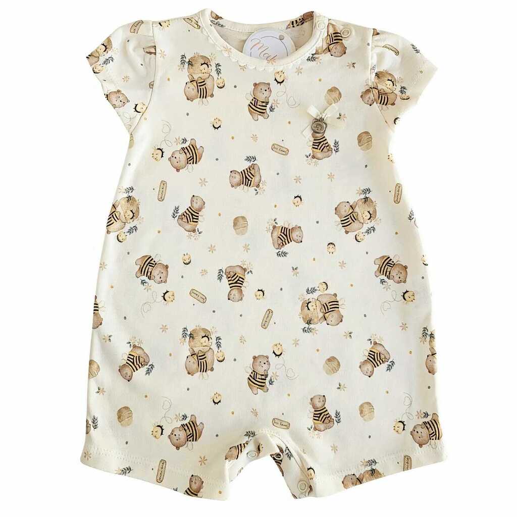 O Macacão Curto Abelhinhas é a escolha perfeita para os dias ensolarados, combinando delicadeza e conforto. Confeccionado em algodão egípcio de alta qualidade, ele traz uma estampa encantadora e lúdica de ursinhas e abelhinhas que transborda fofura. Os detalhes especiais, como o lacinho delicado com uma plaquinha metálica de ursinho e a rendinha aplicada no decote, completam o design com um charme único. O modelo conta ainda com botões de pressão no ombro e entre as perninhas que proporcionam facilidade na hora de vestir e trocar fraldas. Um look perfeito para momentos cheios de ternura!